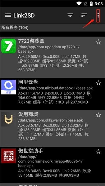 打开Link2SD中文版后,点击页面右上角的三个点图标。