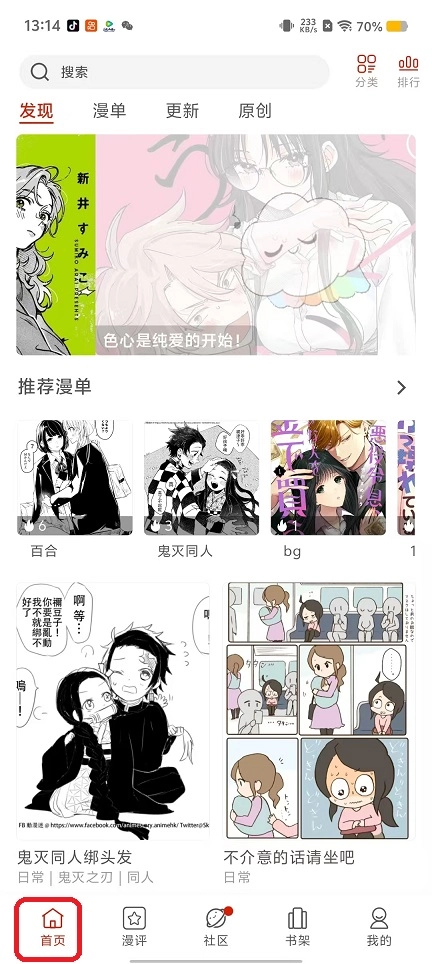 首页,提供漫画搜索,关注原创和最新的分类筛选。