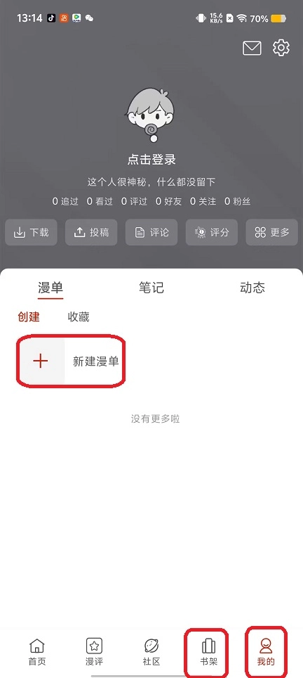 书架管理,添加我的,新建漫单。