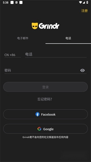 首先启动Grindr应用,进入登录界面后,点击右上角的【注册】按钮。