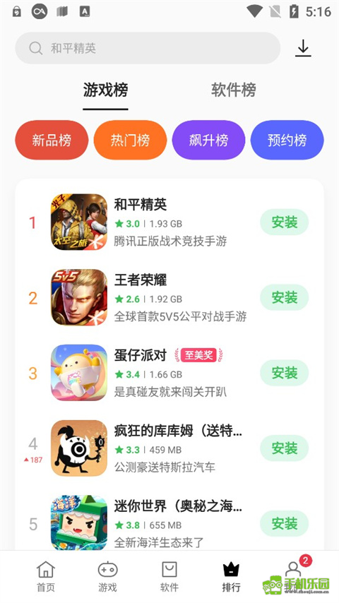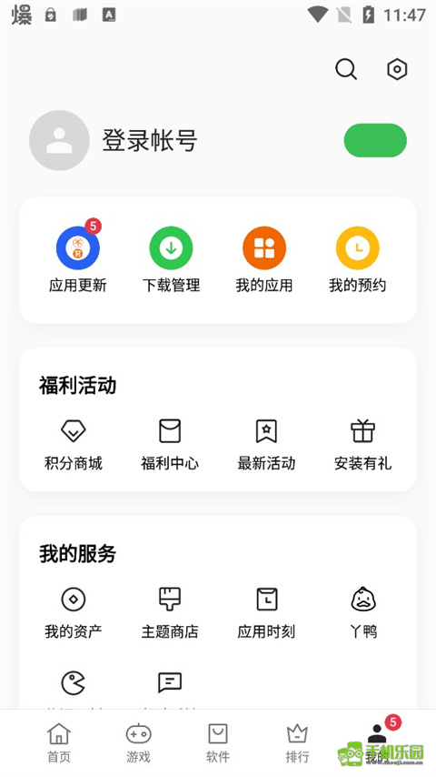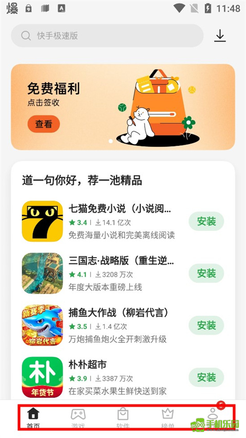 我们能看到这款软件设有五大功能板块,具体包括首页、游戏、软件、排行和我的管理。