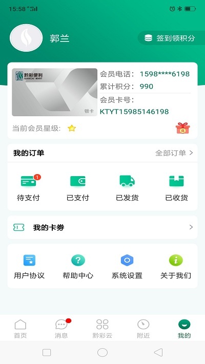 在个人中心页面,用户能够进行签到操作,查看自己拥有的卡券,要是碰到不明白的问题,还可以去帮助中心寻求解答。