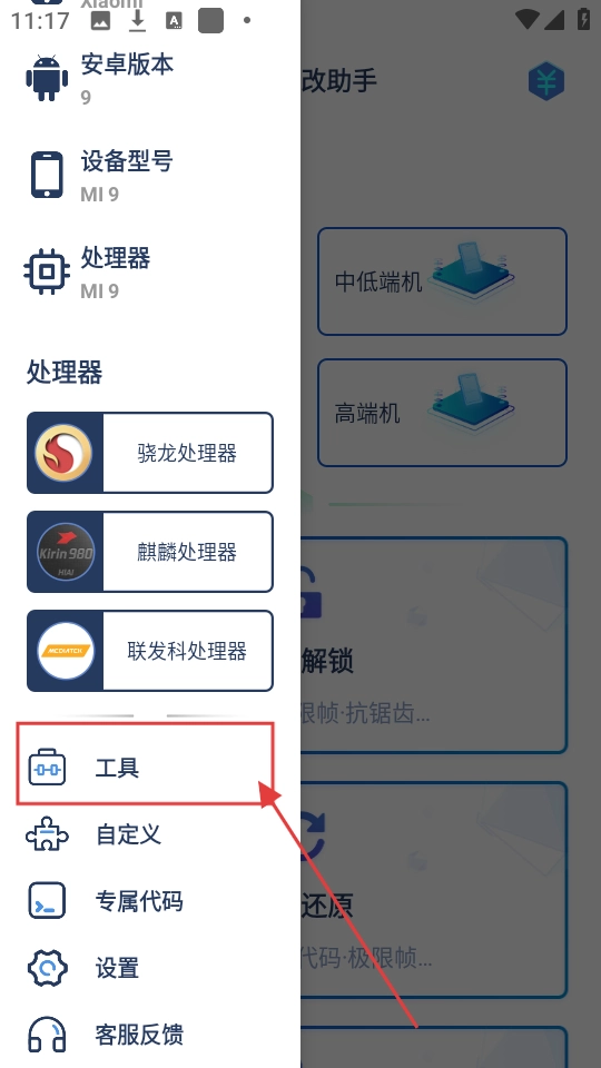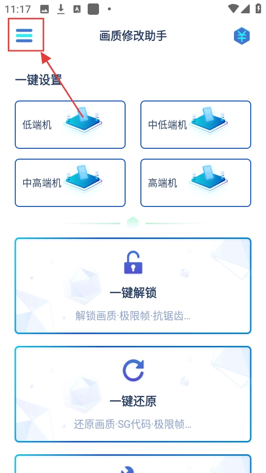 打开画质修改助手后,要是想找工具,就点击左上角的菜单按钮,展开菜单查看一下。
