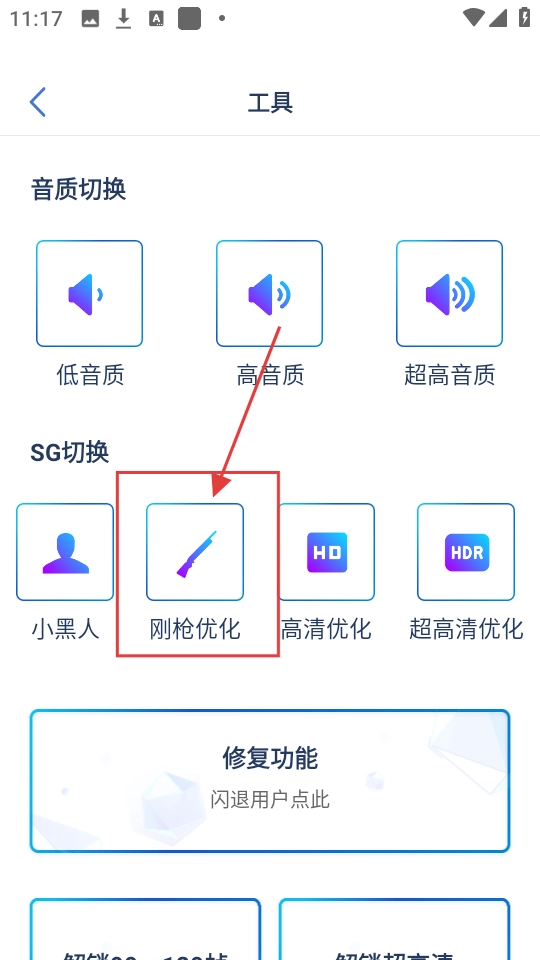 进入工具页面后,你会看到SG切换的选项。要是你希望进行刚枪优化,直接点击【刚枪优化】这个选项就可以了。