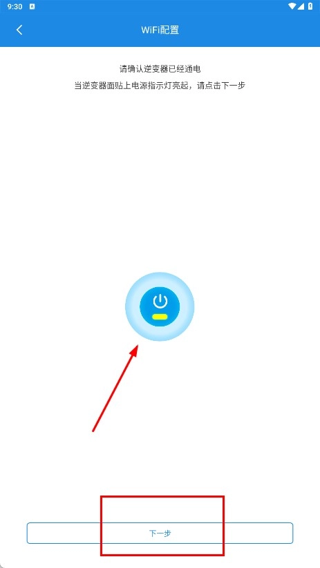4、进入WiFi配置页面,确认逆变器已通电后,点击【下一步-功能按钮】,以便开展后续的配置操作。