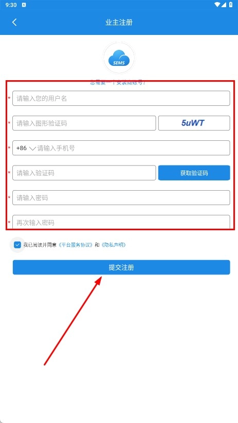 3、若尚未完成注册,可进入业主注册页面,依次填写用户名、验证码、手机号等相关信息,之后点击【提交注册】功能按钮即可。