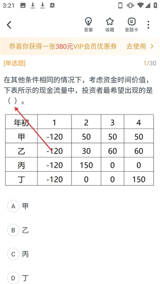 进入题目页面后,就可以开始作答一级建造师工程经济科目的考点题目了。