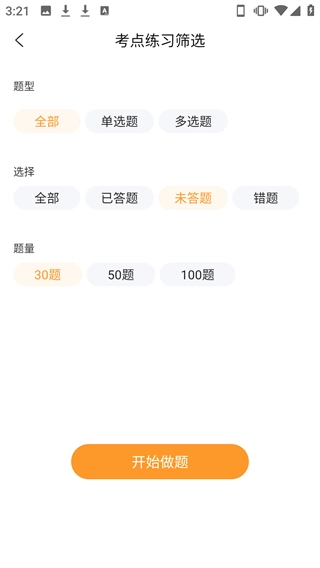 3、在考点练习筛选页面,设置好题型、选择、题量后,点击【开始做题】。