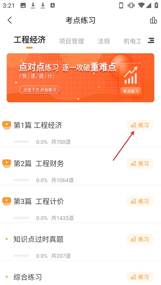 2、进入考点练习页面后,找到【第1篇工程经济】这一项,点击它右侧对应的【练习】按钮。