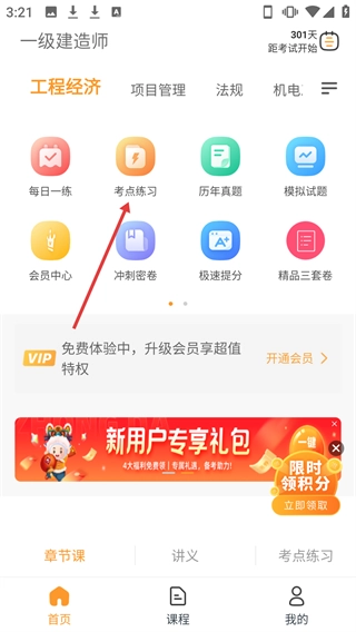 1、在一级建造师首页,找到并点击【考点练习】选项,即可进入对应的练习页面。