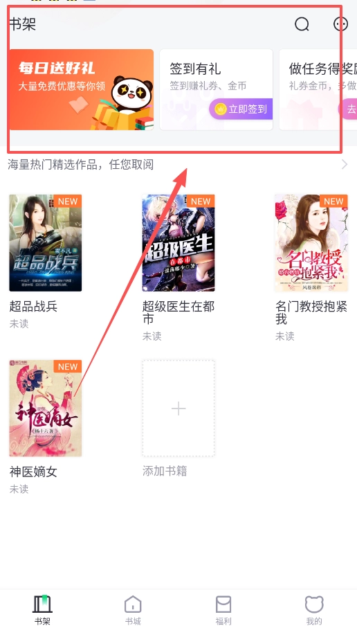 1、建议先熟悉书架页面的布局,页面上方的福利活动区域经常会有免费阅读资源可供领取。