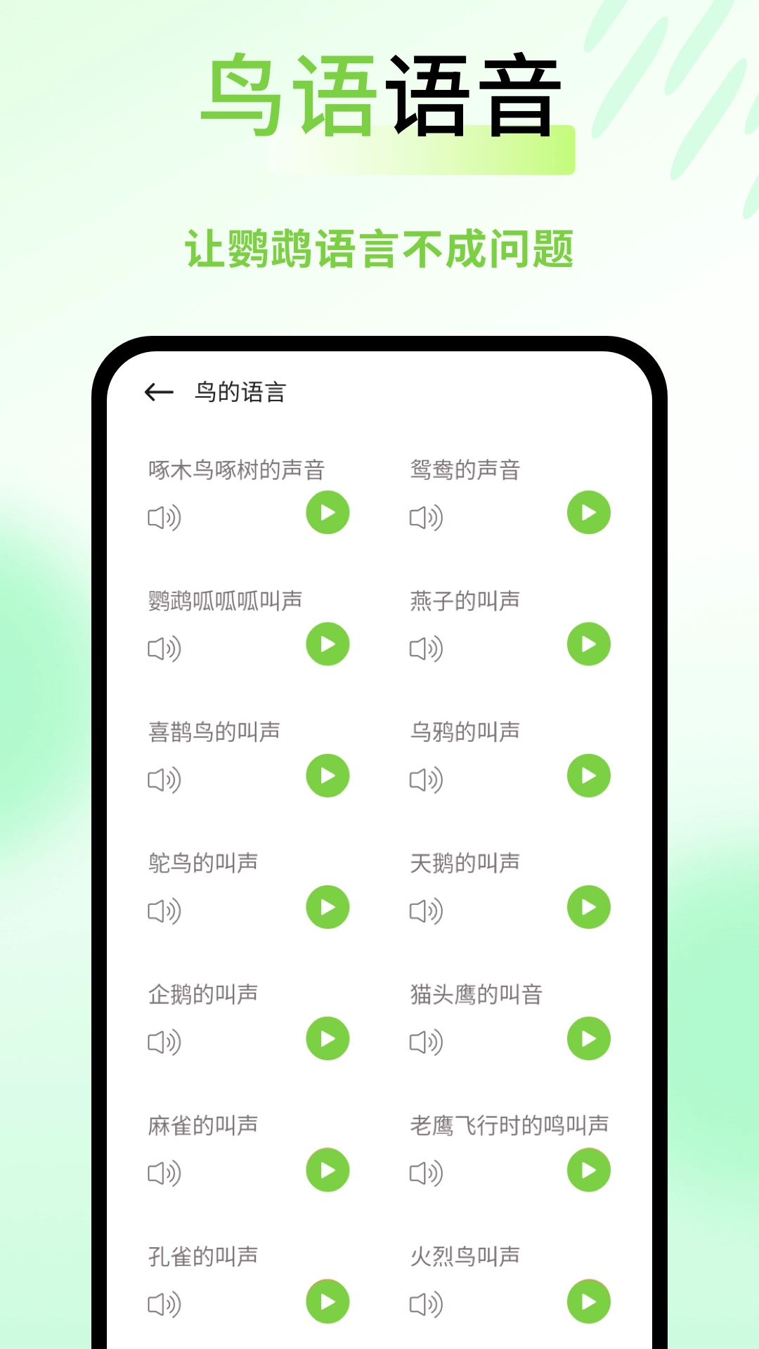 3、整合多种鸟类的鸣叫声,可自主挑选来和鹦鹉互动,让彼此的交流形式更丰富多元,进一步优化互动时的体验。