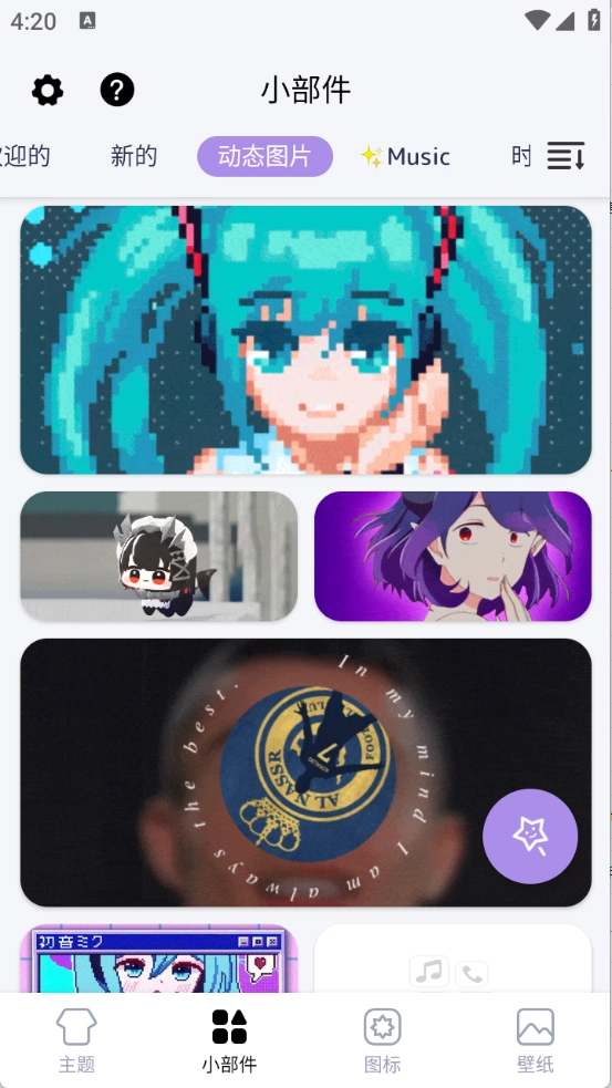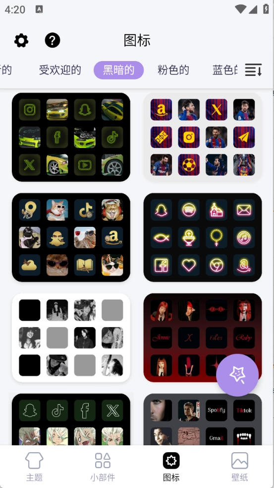 在图标分类页面与小部件分类页面的右下角,各自设有一个紫色的星形图标,点击该图标即可进入DIY功能。