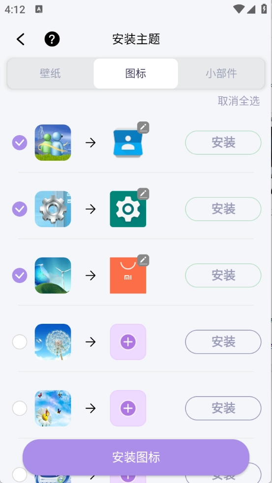 当需要安装图标时,点击“安装”按钮,系统会跳转至权限设置页面。请在此页面中找到并启用“创建快捷方式”的权限,之后返回DIY主题组件库,即可完成图标的安装操作。