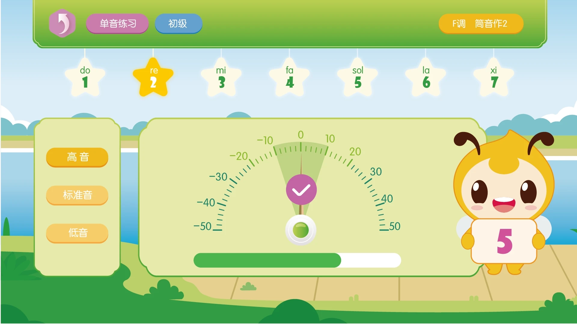 4、单音练习界面配备音高检测仪,演奏对应音符时能查看准确度,助力调整音准水平。