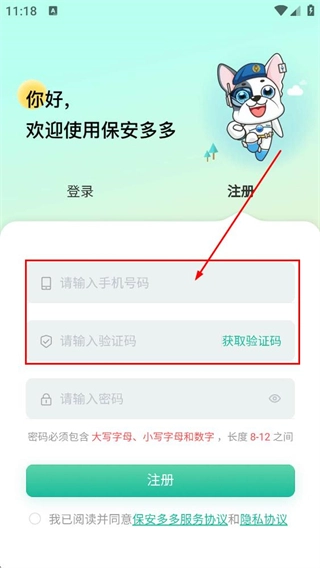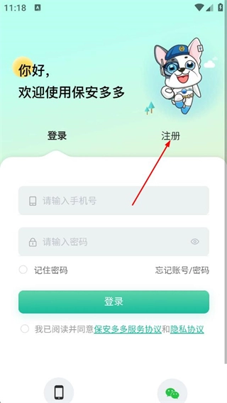 2、进入“你好,欢迎使用保安全多”页面后,点击右上角的“注册”按钮,即可切换到注册操作界面。