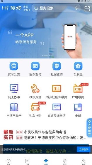 3、成功登录后,在“i宁德”平台上,用户可以进行实时公交查询、医保查询、社保查询以及公积金查询等操作。此外,该平台还涵盖了网上办事、维修资金相关业务、城乡社医保缴费、广电缴费、宁德不动产查询、购车补贴申请、高速互通激活等多项服务内容。