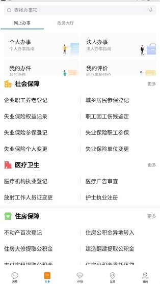4、在“办事”服务功能板块中,你能够依据自身实际需求进行选择,无论是个人办事、法人办事,还是想要了解社会保障、医疗卫生方面的情况,都可以通过这里办理相关业务。