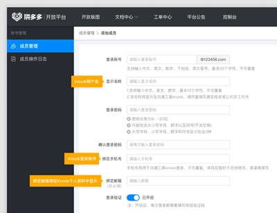 2、若公司其他人员也有此类需求,可通过主账号在“开放平台-个人中心-成员管理”模块创建对应子账号,并根据需要为其赋予权限(无权限需求时也可不设置)。子账号创建保存成功后,绑定的手机号即可直接登录knock,与拼多多工作人员进行沟通,具体操作流程详见下图: