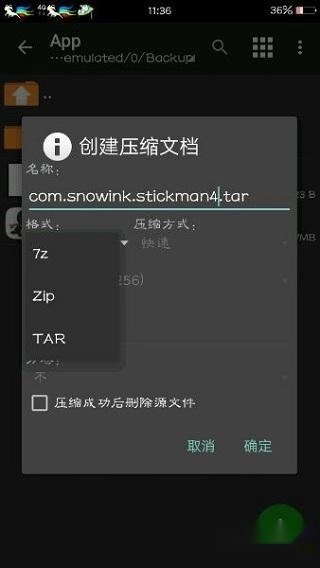 6、打开ZAchiver,先把原来tar格式的压缩包重命名,复制它的名称后就能删掉这个原压缩包;接着长按修改后的data文件,选择“压缩…”选项,压缩格式保持为tar即可。