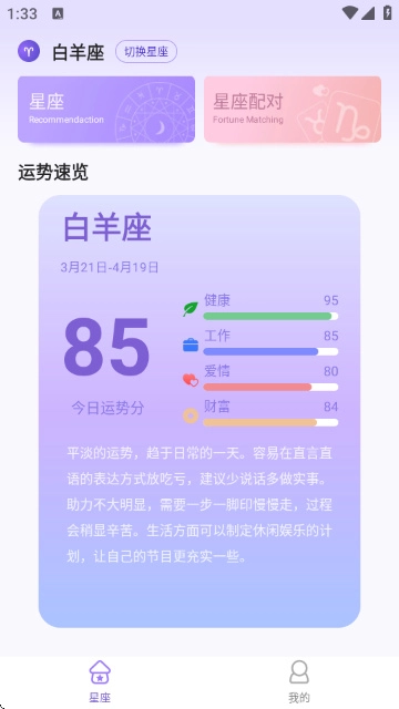 3、进入软件首页后,界面如图所示;该页面为用户提供了星座配对、运势速览等核心功能的入口。