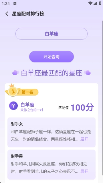 5、当然也能进行星座配对。就像图中展示的那样,先选择一个星座,再选择另一个星座,之后点击【开始查询】按钮,就能得到对应的配对结果了。