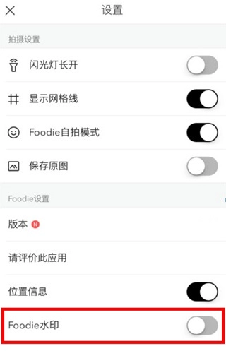 - 进入拍摄设置界面,找到“Foodie水印”这一选项,把它后面的开关滑动到关闭的位置,就能取消水印了。