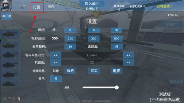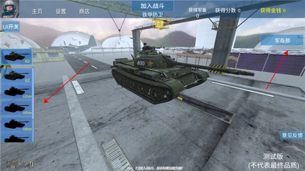 进入游戏界面后,找到屏幕右侧的军备部门入口,通过该入口可对坦克进行性能提升操作;若想改变坦克的视觉呈现效果,则需点击左侧对应的设置项来调整外观样式。