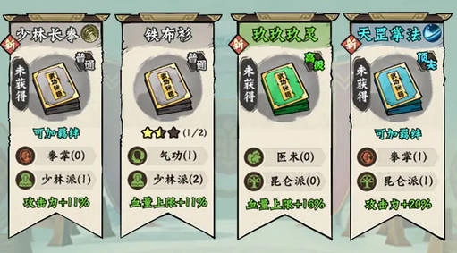 搭配思路如下:前10关可以学习少林长拳、铁布衫、太清掌法和太清罡气;20关之前建议优先学习新武功,以此凑出核心羁绊效果;25关前要学习乾坤大挪移,借助它免疫怪物首次攻击的特性,之后点出几个2星的紫橙色招式,在峨眉羁绊的加成下输出会直接拉满,最后再把所有羁绊效果都补齐就可以了。