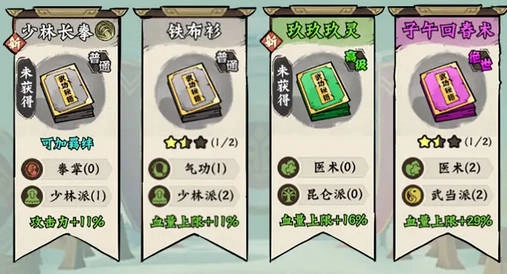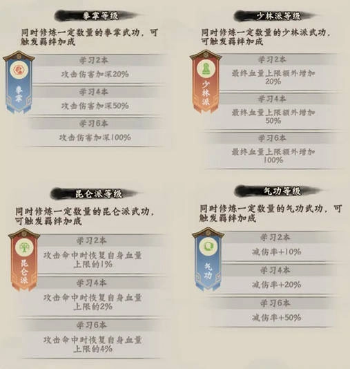 这套阵容的搭配逻辑是:前期主要依靠少林派提升血量上限、昆仑派提供百分比回血的羁绊效果来稳固自身血线,同时借助拳掌武学的攻击伤害加深机制打输出;中期拿到蓝色神通“神龙素女功”后,优先将其升到3星就能让流派成型——核心是通过少林与内功羁绊叠加的高额血上限,再加上3星内功神通带来的“已学同门派武功星级+1”的增益,以此实现胜利。