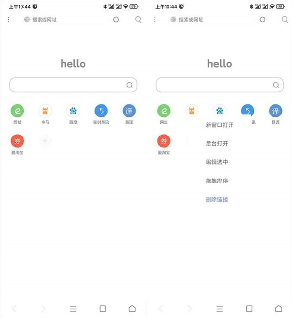 安装完成后,「米侠浏览器」的默认启动页十分清爽简洁,不会像部分浏览器那样推送新闻之类杂乱的功能。要是你对自带的网址不满意,还能通过长按操作来删除、编辑,或者自行添加常用的访问网址。