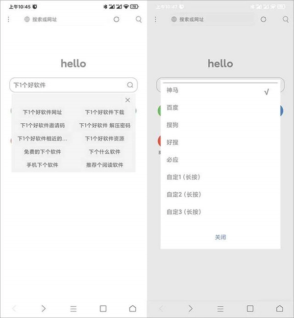 当你在搜索框输入关键词时,系统会自动弹出相关的搜索建议;默认使用的搜索引擎是神马搜索,它的广告相对较少,但搜索结果的质量可能不如某度。你可以通过长按搜索框来修改默认搜索引擎,也支持自定义设置。