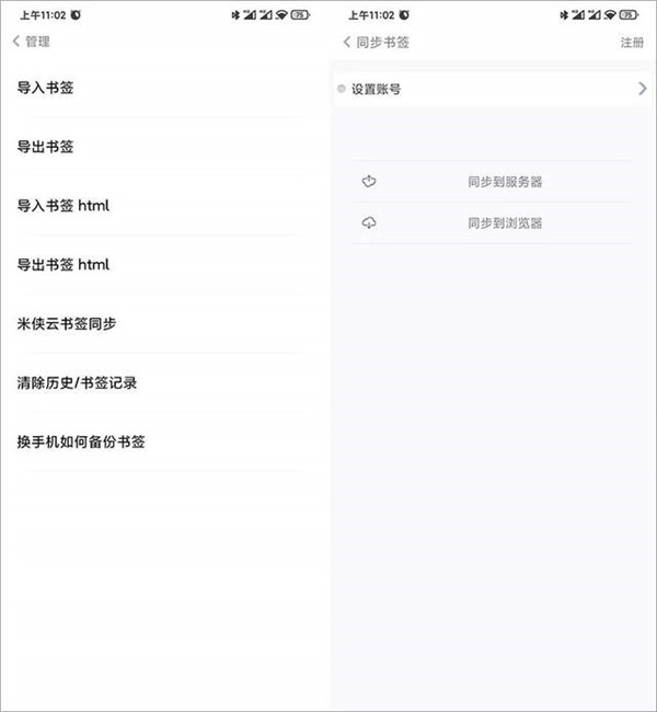 最后再来说说书签功能,它支持导入你之前使用的浏览器里的书签,也支持html格式的书签文件。要是你需要书签同步功能,那就可以通过注册米侠同步账号来实现。