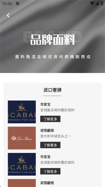 进入“品牌面料”板块后,您可以浏览世家宝、诺悠翩雅等进口奢牌面料,点击“了解更多”按钮即可查看面料的详细信息。