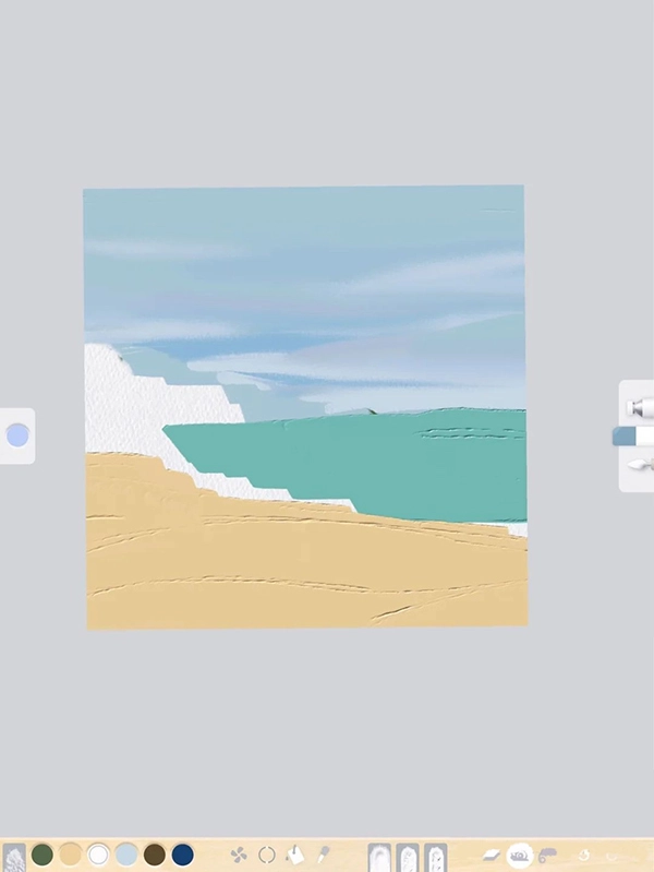 2、使用刮刀来铺设大色块,通过吸取颜色来调配深色、浅色或是调整色相进行混色,混色过程采用油画笔刷操作,再借助磨平纹理工具完成融合。这种混色方法适用于天空、沙滩等需要自然过渡的场景。