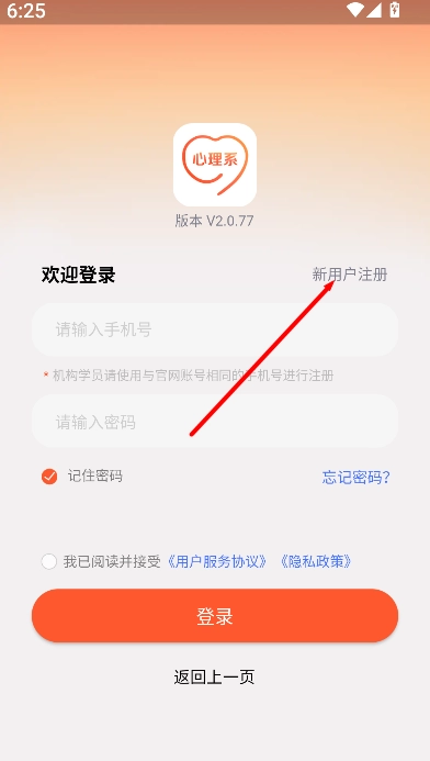 要是第一次使用,你可以点击“新用户注册”,按照页面给出的提示填写好相关信息,完成注册之后,就能开始浏览课程和心理方面的内容了。