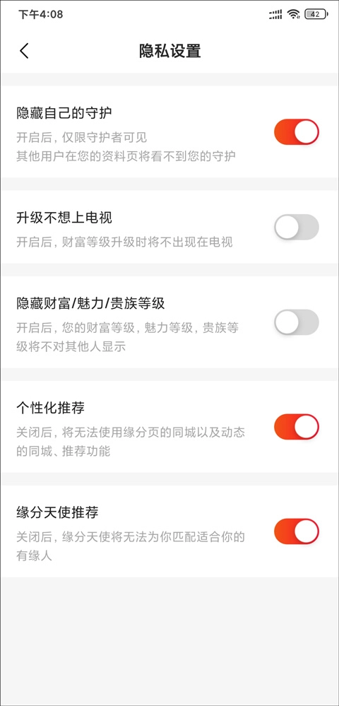 隐私设置界面点击“隐藏自已的守护”后面的圆点