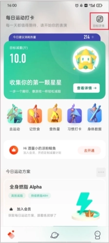 1、打开应用,使用本机登录的账号进入主界面,主界面呈现的功能有去运动、记饮食、查热量、习惯打卡、身体数据,点击右上角的“目标详情”选项。