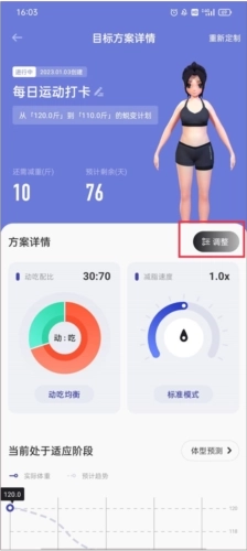 2、进入目标方案的详情页面后,你能看到当前处于适应阶段的折线图,还有动吃配比数据等信息,接着点击红色框框里选中的“重新定制”按钮。