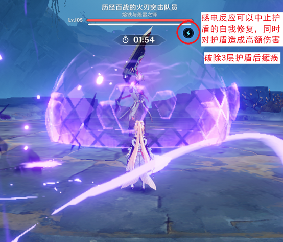 火刀队员入场后会立即展开三层防护罩,每层对应自身血量上限的4.5%(大约41万)。这层防护罩除了雷元素抗性为0外,其余所有元素抗性均达到70%,并且会以较快速度进行自我修复。不过,当使用感电或月感电攻击防护罩时,就能终止它的自我修复效果。不仅如此,感电反应对防护罩的伤害会额外增加600%,月感电反应的伤害加成则为200%。一旦防护罩被成功破除,火刀队员的雷元素抗性会降至-100%,其他元素抗性也会降低到-40%。