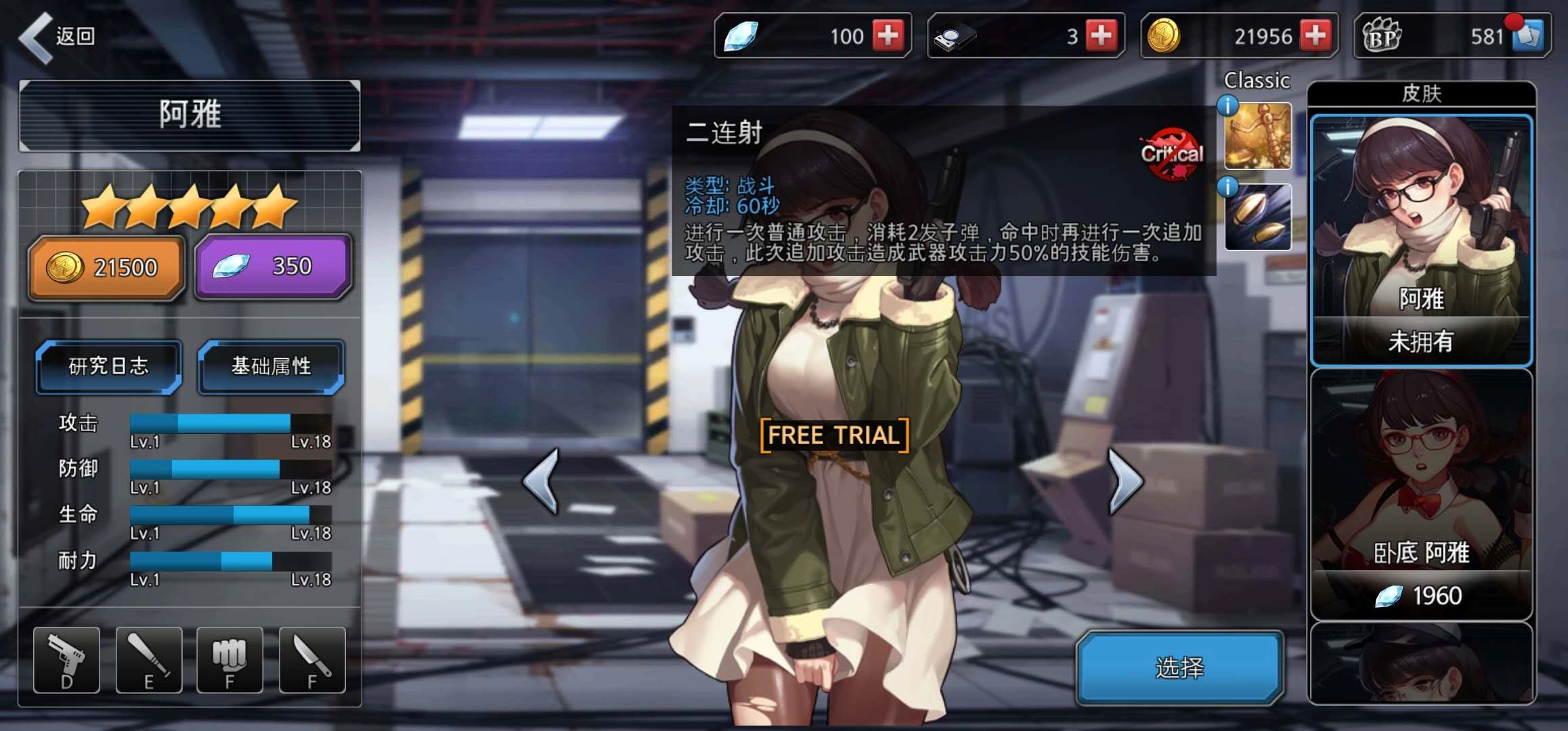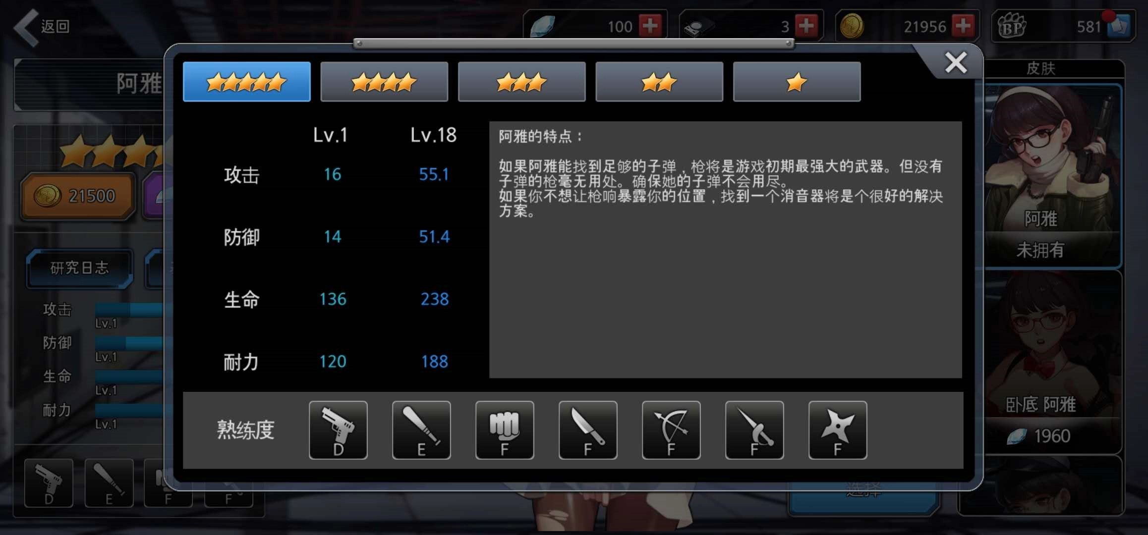 首先我们通过人物模型简单了解一下:阿雅是个外表柔弱的萌妹子,身着连衣裙,手里却握着一把手枪。萌妹子为何手持手枪?这是因为在游戏里,她必须为了生存而战斗。由此不难推断,阿雅的攻击属性中,枪械应该是最强的。当我们点开基础属性栏会发现,阿雅的枪械熟练度为D,钝器熟练度为E,其余五种攻击方式的熟练度则全部处于较低的F等级。