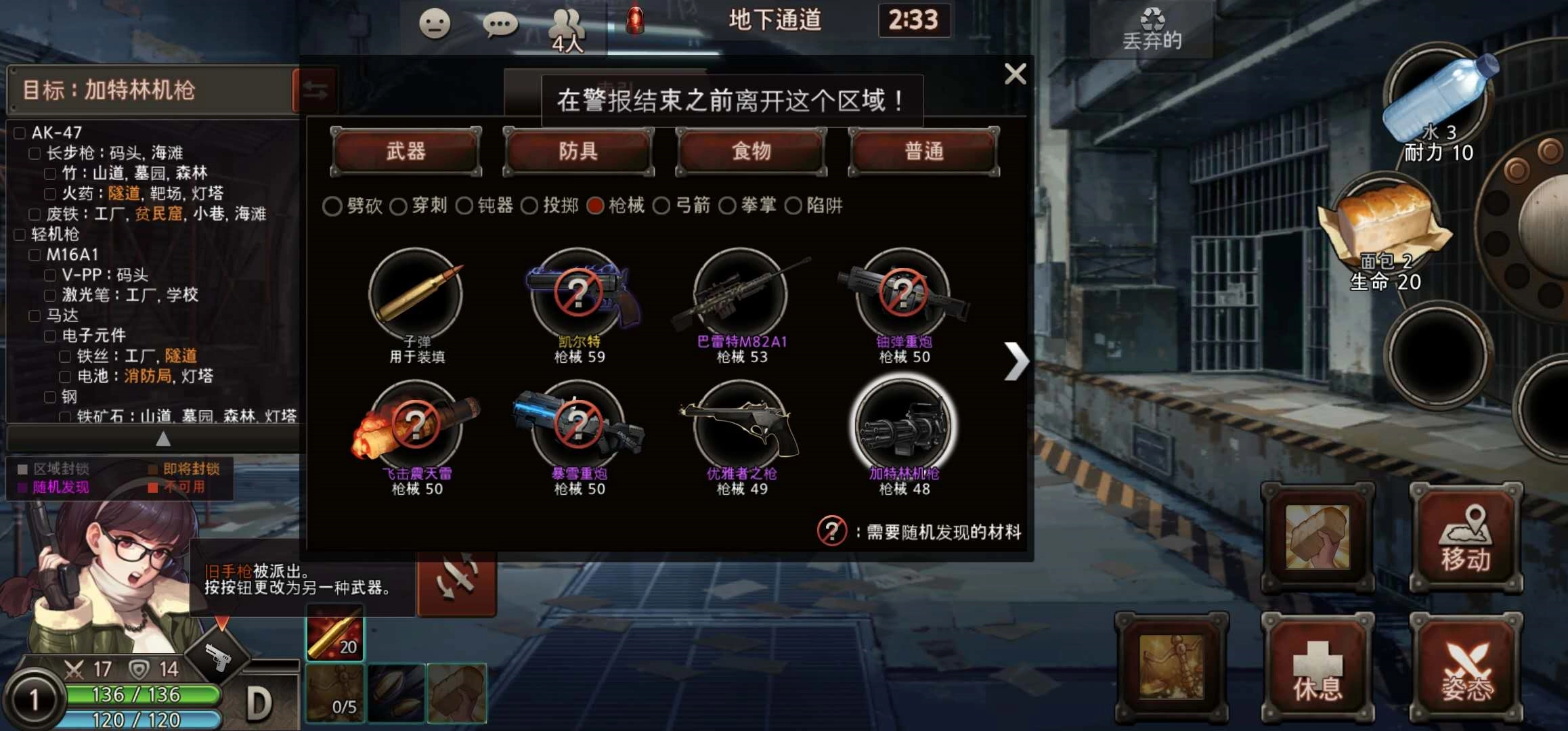 接下来我们可以前往码头找到那把绿色的枪械V-PP,接着去工厂和学校搜寻激光笔。等拿到这两样东西后,我们启动锻造模式,就能把它们打造成m16a1。之后我们还能再次开启锻造模式,将马达和m16a1合成为轻机枪。当拥有轻机枪和ak47后,我们就可以进行最后的锻造,把它们制作成我们的紫色材质武器加特林机枪。