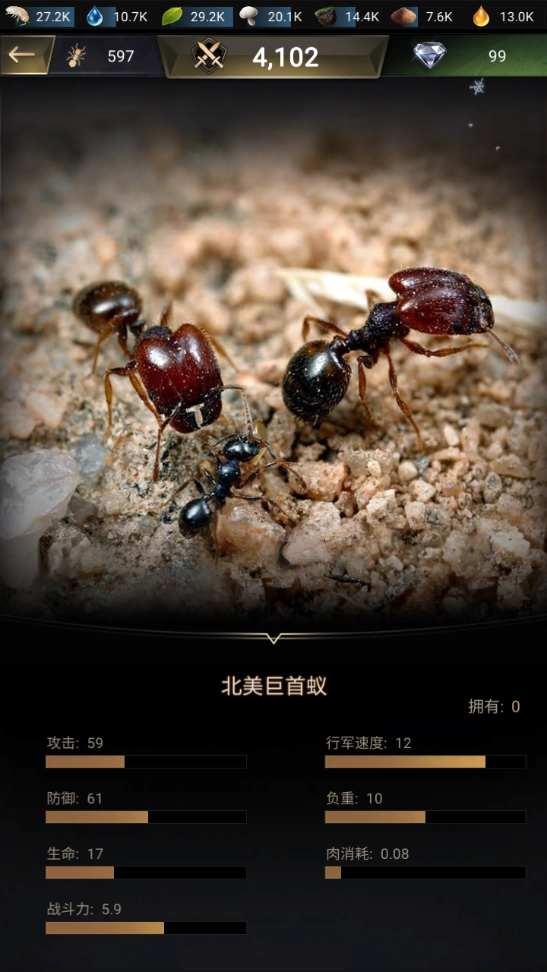 这是所有近卫蚁里综合战力最强的角色,唯独在速度和负重方面比另外几种强势蚂蚁略差一些,像攻击、防御、生命值这类属性,全都远超其他蚂蚁,当然,它对肉类的消耗也会更大。