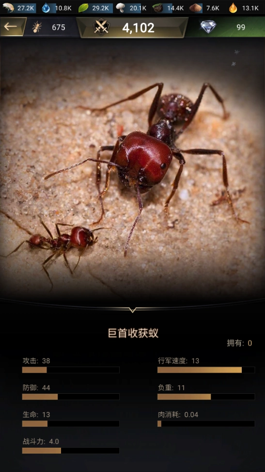 这种蚂蚁的防御值有44,在同等级别里表现已经很不错;而且它的速度和负重能力堪称全游戏近卫蚁中的顶尖水平,加上获取时间早、消耗的肉量也低,所以算得上是性价比最高的蚂蚁之一了。