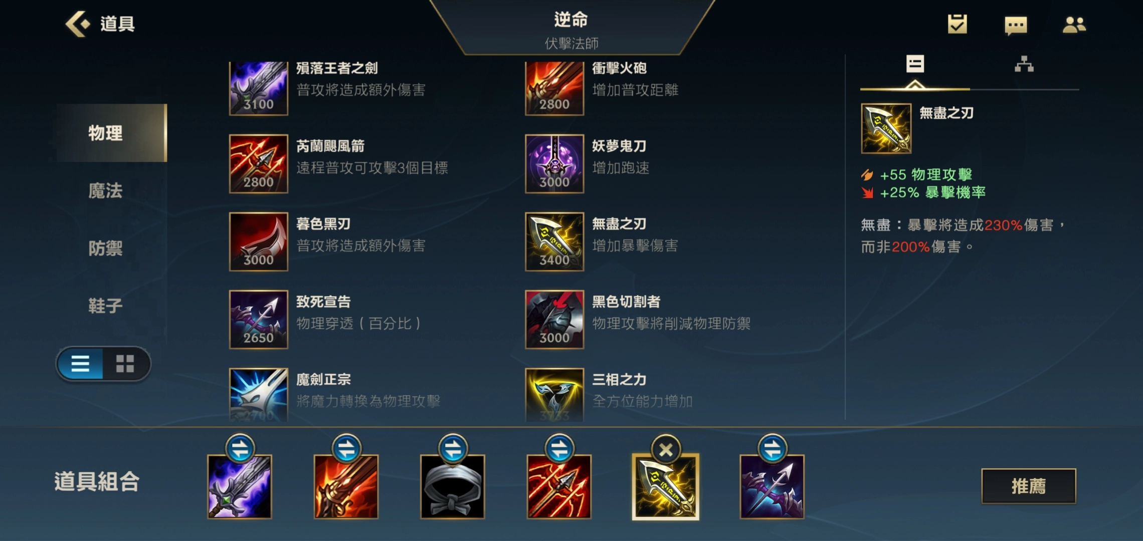 第五件装备选择无尽就可以了,无尽能够增加自身的暴击率与暴击伤害,这件装备出完之后,AD卡牌在团战中的伤害会有显著的提升。