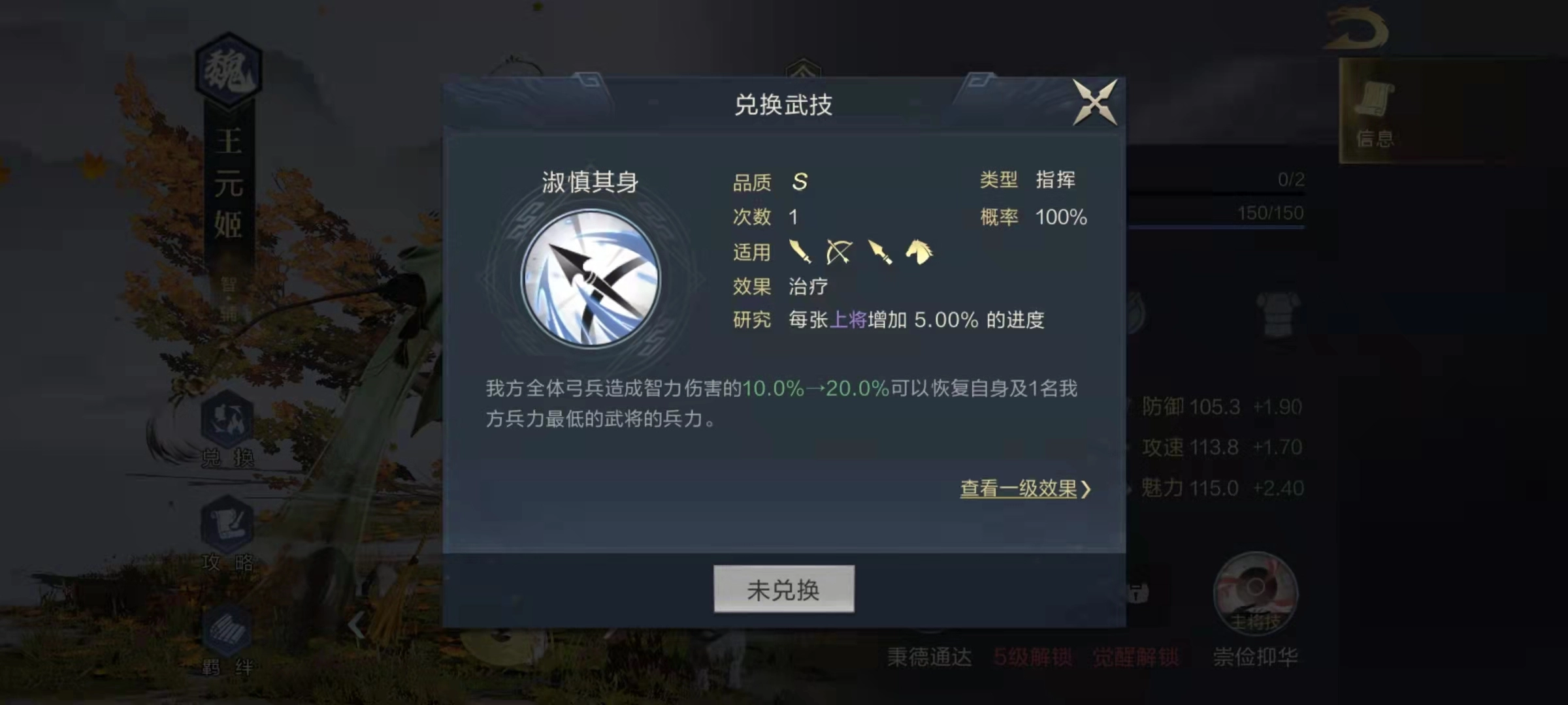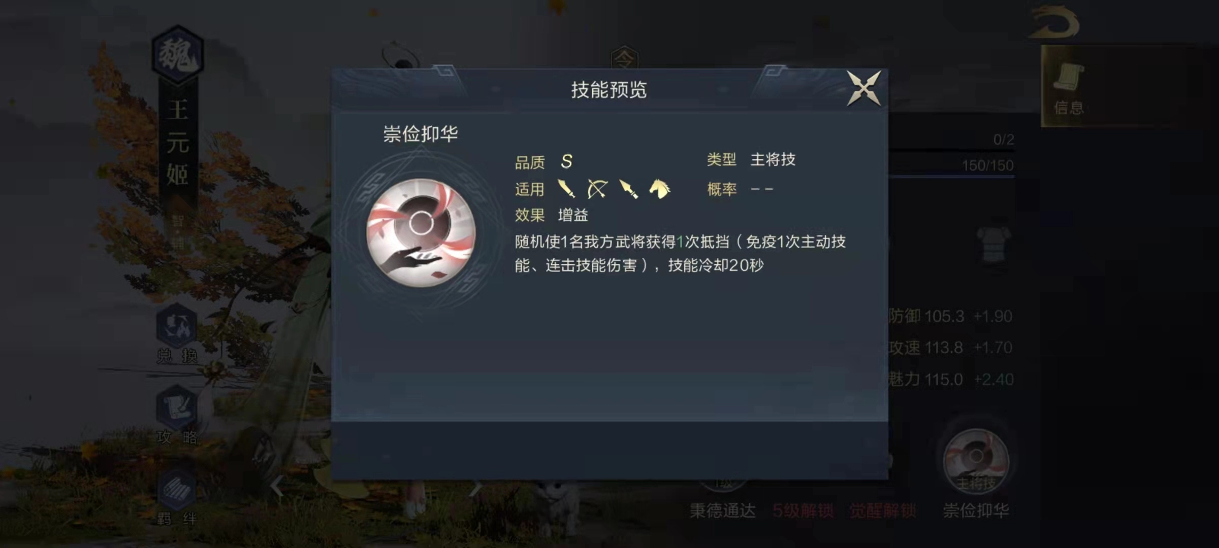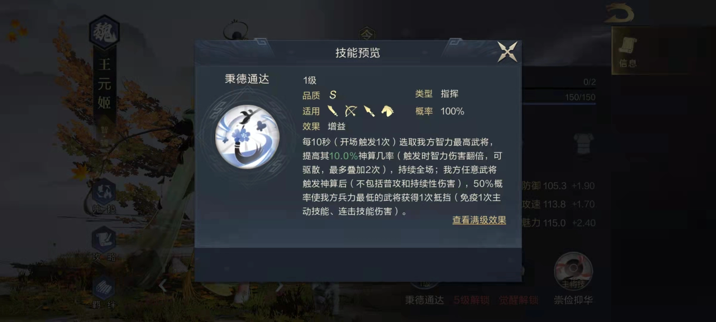 王元姬的自带主动技能是典型的辅助类型,能有效保护己方其他武将。当敌方存在连击型武将或主动技能伤害极高的武将时,王元姬完全可以担任主将,帮助队伍抵消大量伤害。该技能的具体效果为:战斗开始后,每间隔十秒便会选定我方智力最高的武将,提升其神算几率——神算等同于暴击,触发后可使伤害翻倍;若神算成功触发,还将有概率让我方兵力最低的武将获得抵挡效果。
