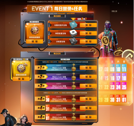 活动1:每日登录与任务在活动开展期间,只要完成每日登录操作,就能得到活动专属道具“新锐启航徽章”,并且可以从三个宝箱里挑选一个作为登录奖励;完成每日时长任务,则可获取活动道具“破晓先锋勋章”。另外,每周末(周五至周日)这三天里,任意一天完成时长任务,都能额外获得一个幸运G-Coin宝箱(内含100到10000 G-Coin,有效期7天);而在1月30日到2月1日这三天中,每天完成时长任务都能获得一个幸运G-Coin宝箱(内含100到10000 G-Coin,有效期7天)。
