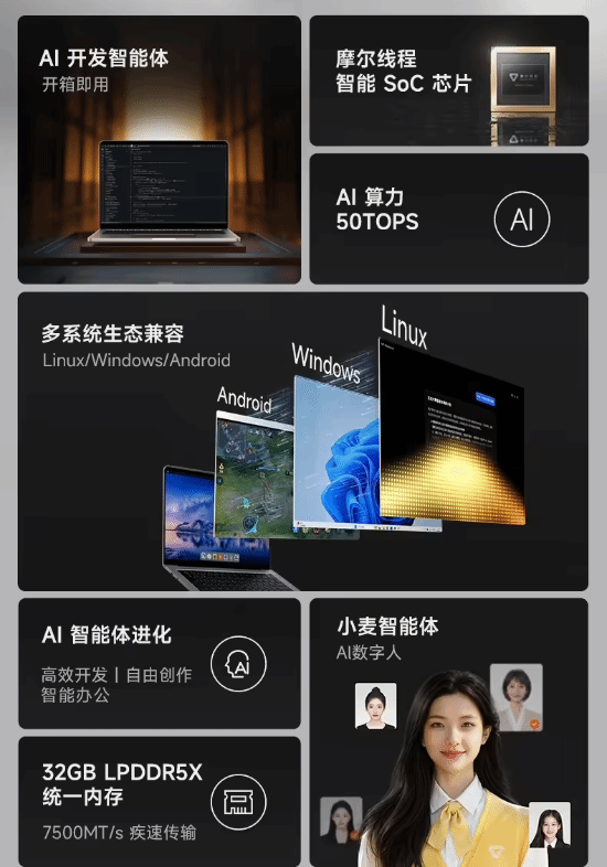 这款笔记本电脑搭载了摩尔线程最新发布的长江智能SoC芯片,配备32GB LPDDR5X统一内存(速率达7500 MT/s),能够提供50 TOPS的AI算力,整机性能释放范围在60至89W之间。